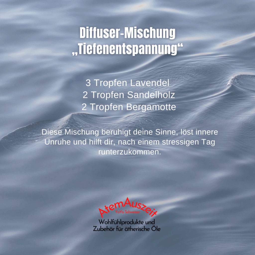 Diese Diffuser-Mischung mit ätherischen Ölen ist wie ein sanfter Anker inmitten des Trubels. Die Öle wirken beruhigend, ausgleichend und lösen innere Spannungen. Mit jedem Atemzug darfst du ein Stück tiefer sinken – in die Ruhe, in die Stille, in dich selbst.